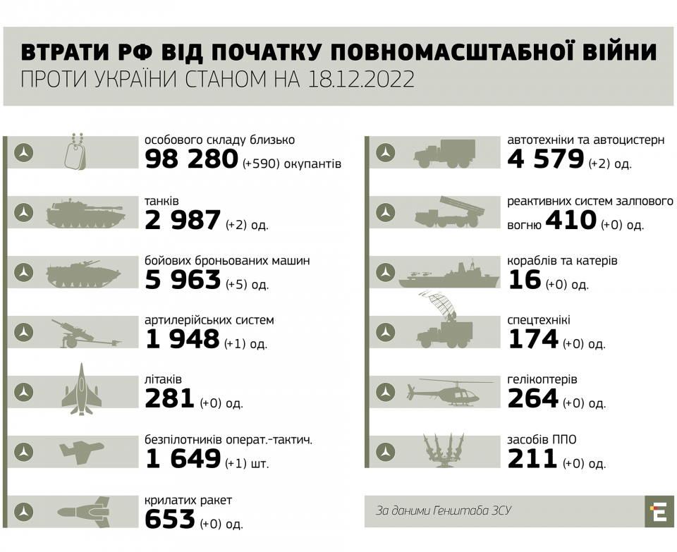 За повідомленням Генерального штабу ЗСУ загальні бойові втрати противника з 24.02 по 18.12 орієнтовно склали: